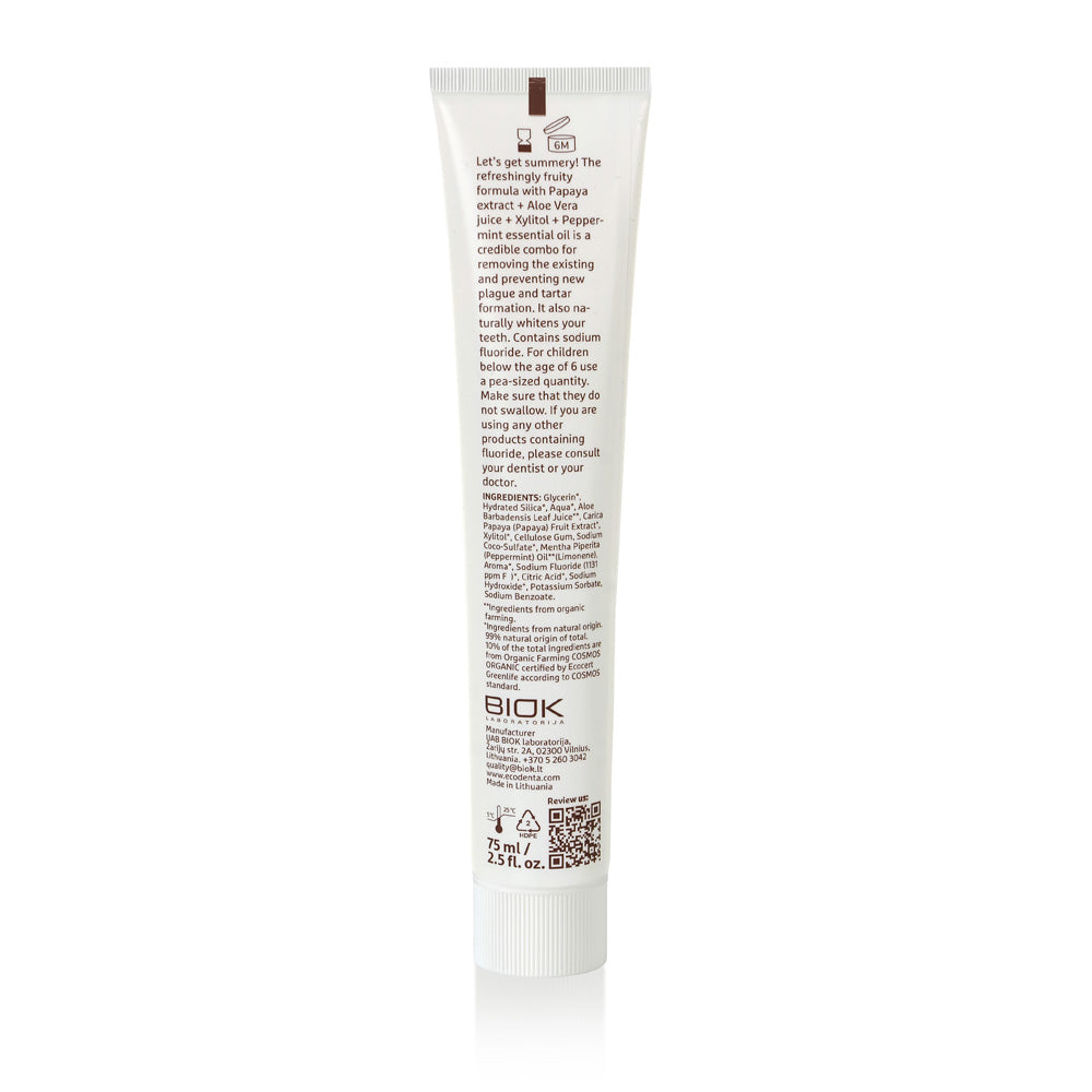 Een ecologisch gecertificeerde tandpasta voor dagelijkse verzorging. De actieve ingrediënten van papaja-extract bevatten enzymen die de tanden veilig bleken en wrijven de tanden op een veilige én natuurlijke manier schoon zonder het tandglazuur aan te tasten. Tandplak en aanslag worden effectief verwijderd en de natuurlijke witheid van de tanden wordt hersteld. Xylitol en een kleine hoeveelheid fluoride voorkomen tandbederf, ontstoken tandvlees en gaatjes en maakt je tanden sterker.