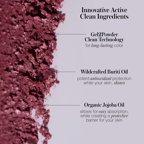 De van suiker afgeleide natte poedertechnologie combineert een romige textuur met een langdurige 3D-afwerking. Huidverzorgende ingrediënten zoals buriti en biologische jojoba-oliën voeden en verzachten.